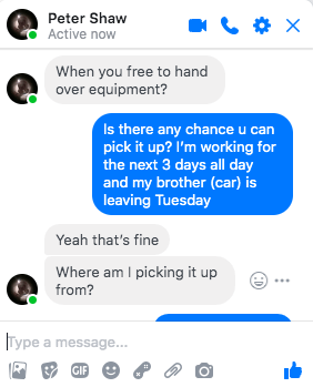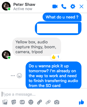 After production, I contacted Peter in my class and we organised a time for him to come and pick up all the equipment he needed. I ended up using only the gimbal, and so the dolly was not needed. See below for my communication with my classmates.