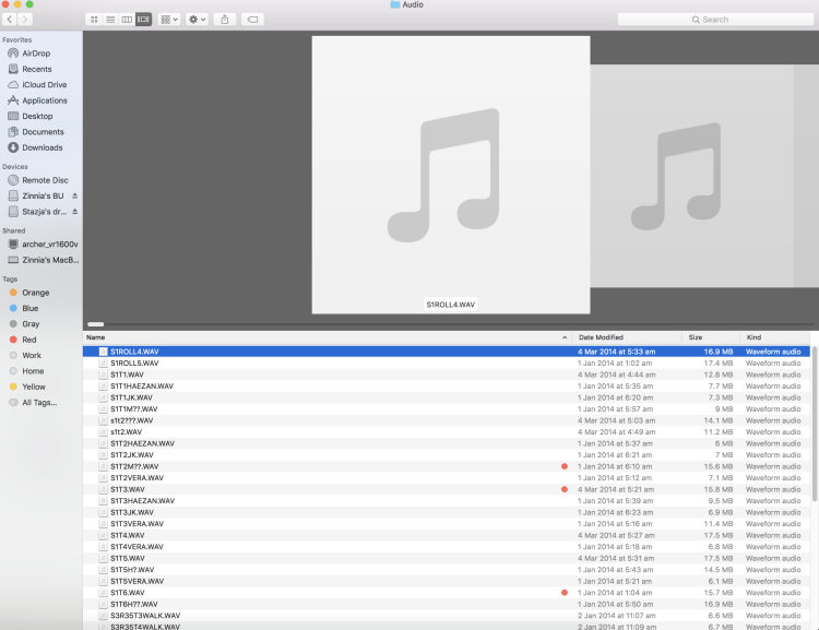 For the audio files, I went through each recording and labeled it according to what we had said and written on the clap board (this board saved my life in post!). I used short hand that I understood to name the files, such as: S3R35T4WALK (scene 3, roll 35 (from shot-list), take 4, the action taking place).