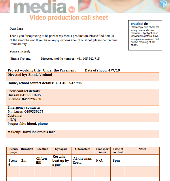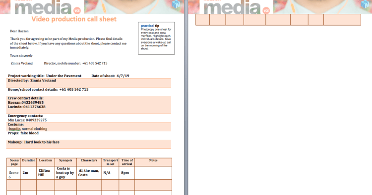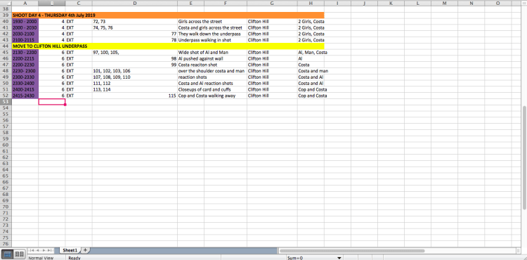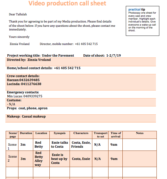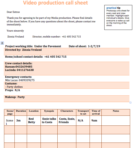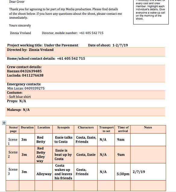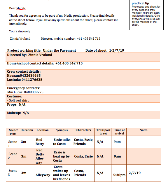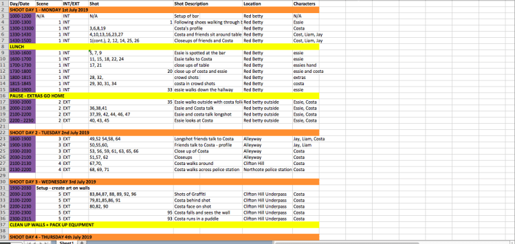 Shooting schedule/ call sheets Shooting Schedule Call Sheets Share this: Click to share on X (Opens in new window) X Click to share on Facebook (Opens in new window) Facebook Like Loading...