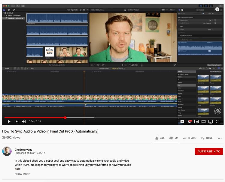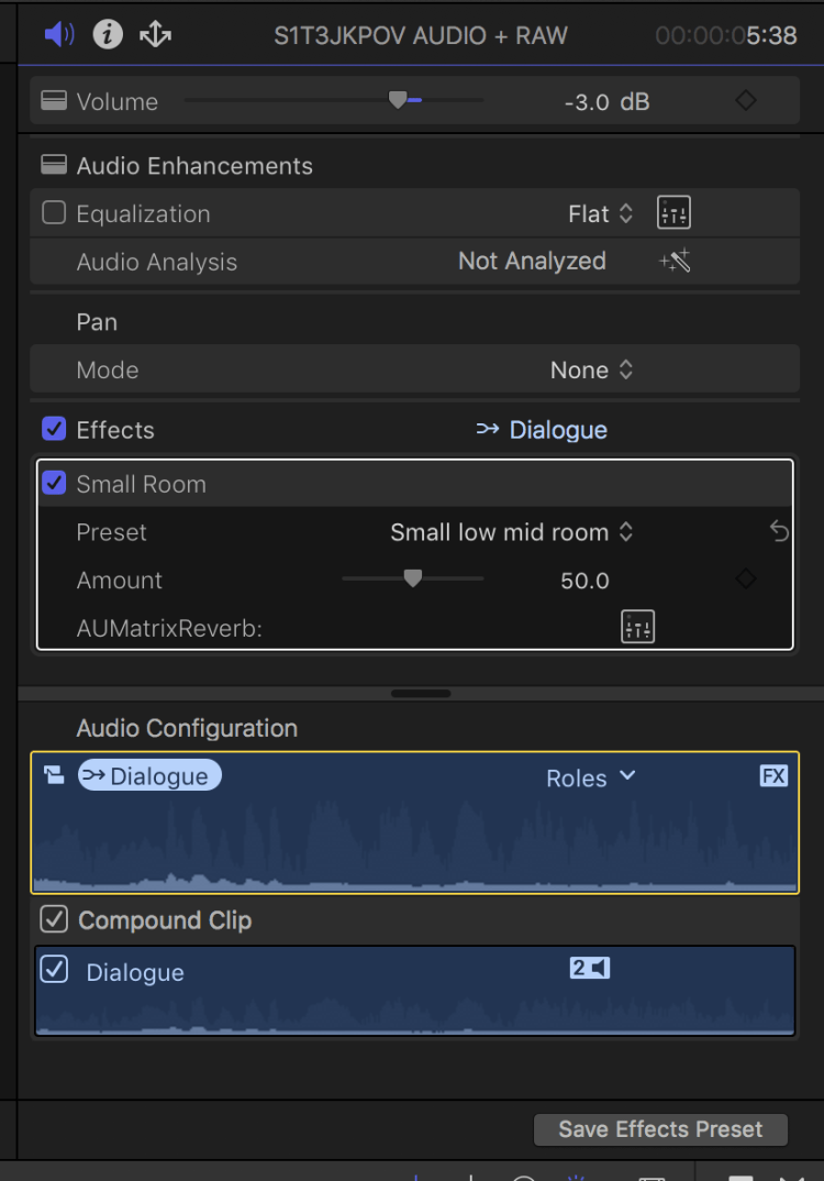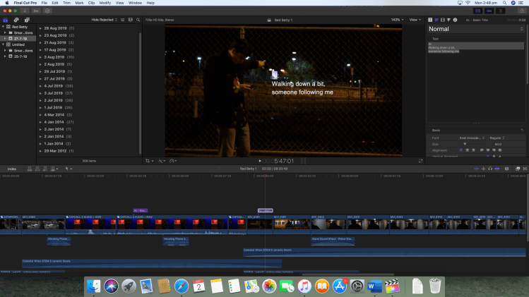 Sound: There were many times throughout post-production when I had to rely on tutorials to teach me how to do certain things. Sound is a big importance to me, and therefore I spent a lot of time learning how to perfect it. This is an example of when I did that (the the left). I needed to learn how to sync audio to image, and I learnt how to do it through Final Cut Pro. I then added an ‘effect’ on the audio to make it sound like the characters are in a bar, therefore I added the ‘small room’ effect.